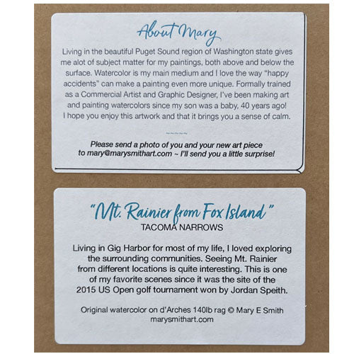 This piece captures one of my favorite views of Mt. Rainier, painted as seen from Fox Island where water, sky, and mountain come together in a breathtaking sweep of blues and greens. The soft washes of paint create a sense of distance and atmosphere, while delicate details invite you to linger in the scene.